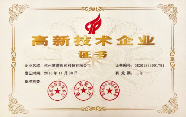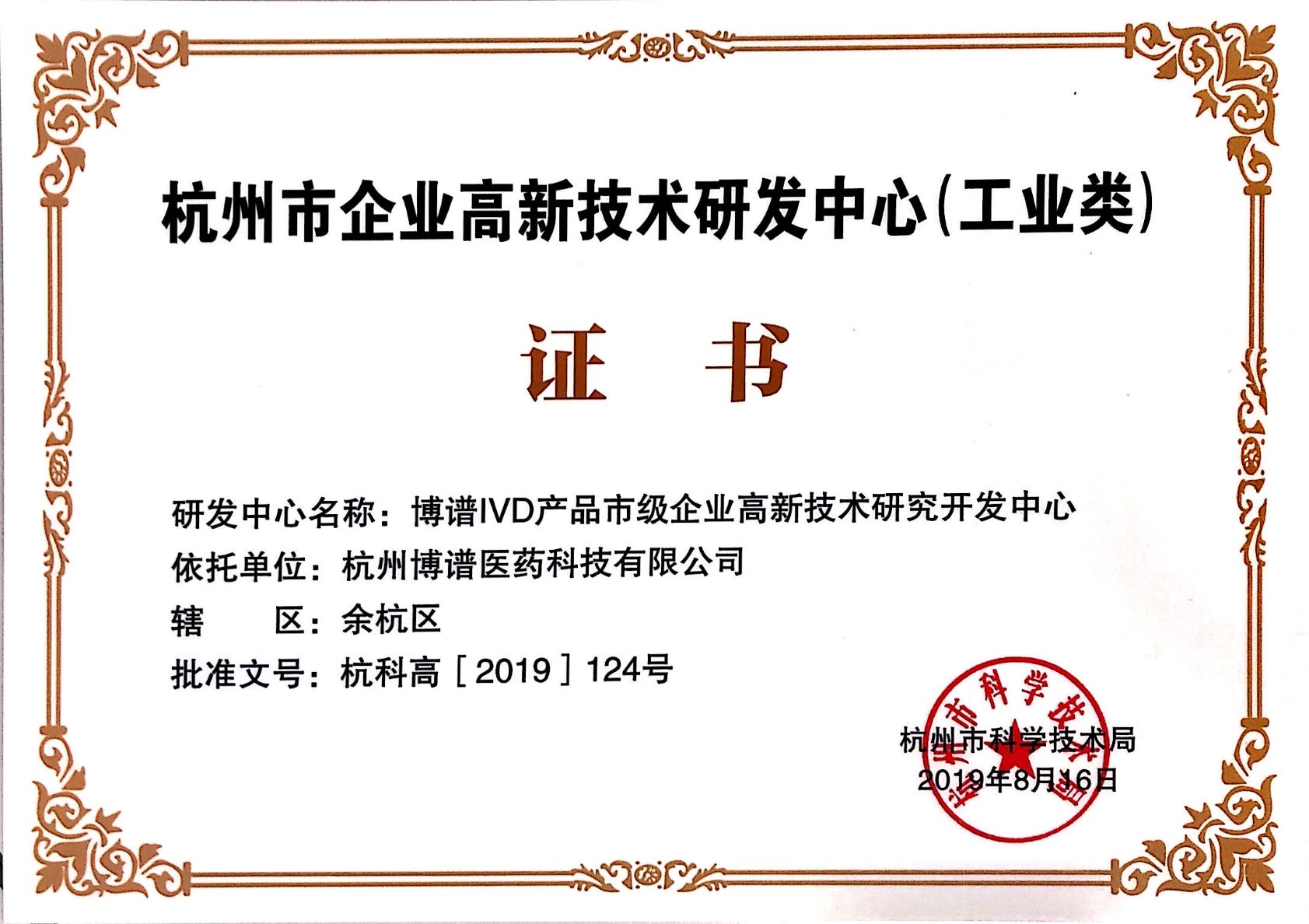 杭州博谱医药科技有限公司 2010年12月成立于杭州市未来科技城海创园,公司的主要发起人为海外高层次留学人员及国内IVD行业专业人员,公司具备将前沿科学技术转化为产品的丰富经验和能力,拥有现代化的基因分子克隆,细胞培养,微生物发酵,酶蛋白纯化,冷冻干燥,全自动生化分析仪等研发仪器及生产设备。2013年被浙江省科学技术厅认定为浙江省科技型中小企业,迄今已获得17个生化诊断试剂项目二类医疗器械注册证书,2018年被认定为国家高新技术企业。2019年被认定为企业高新技术研发中心。